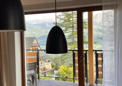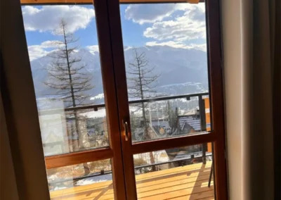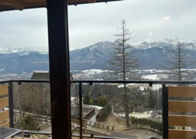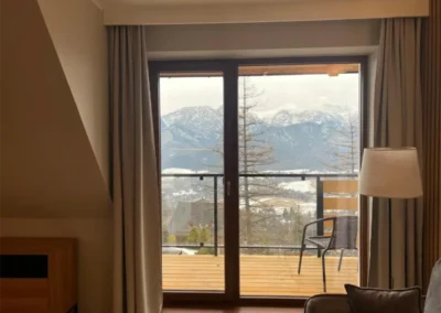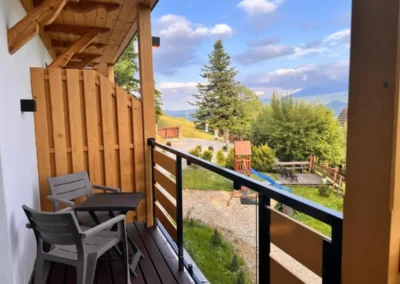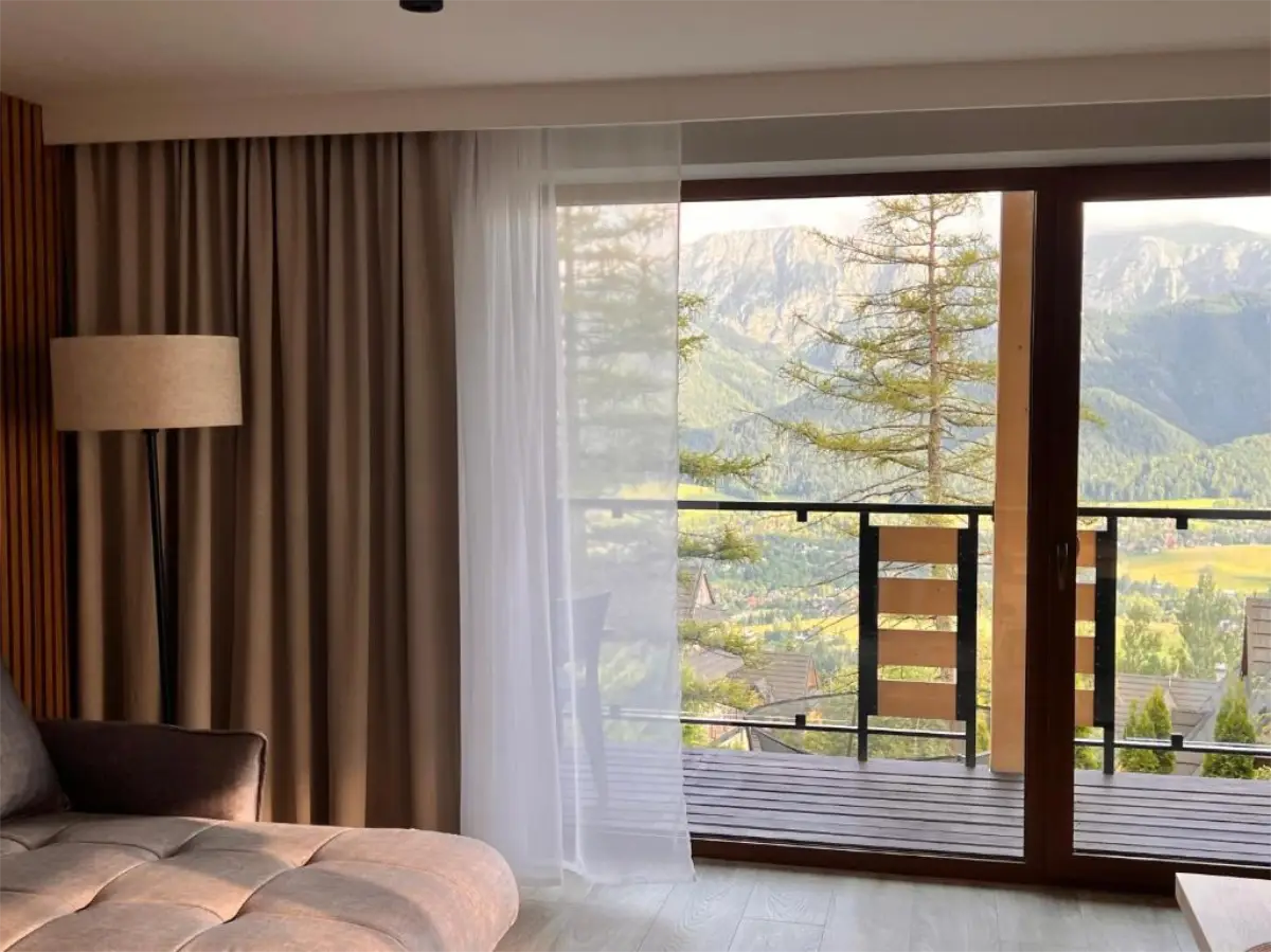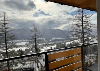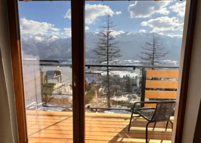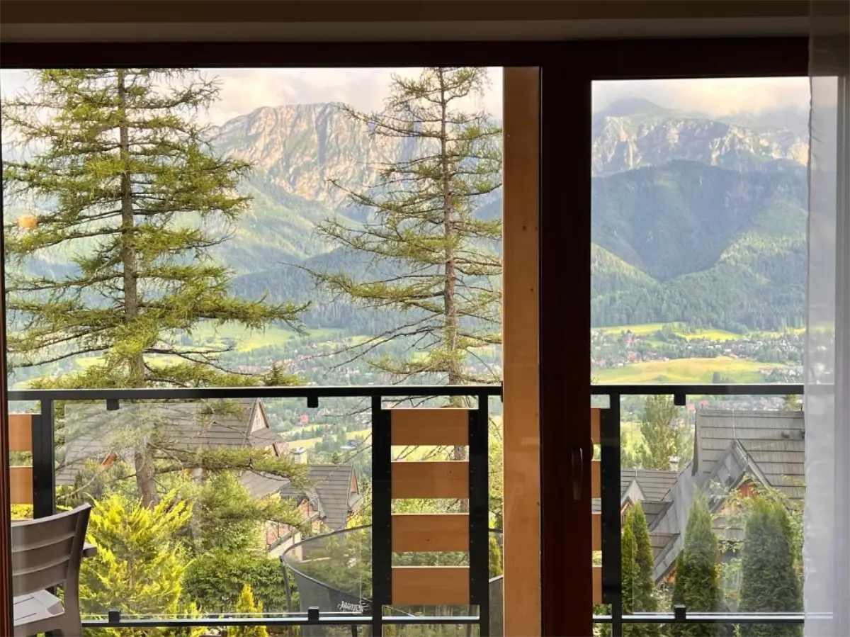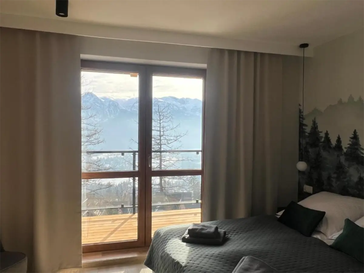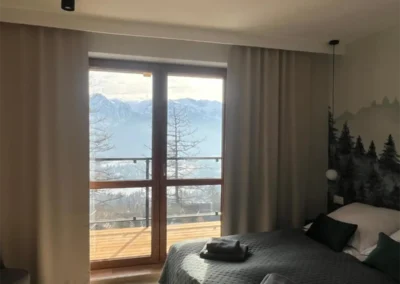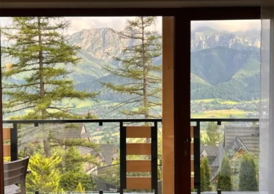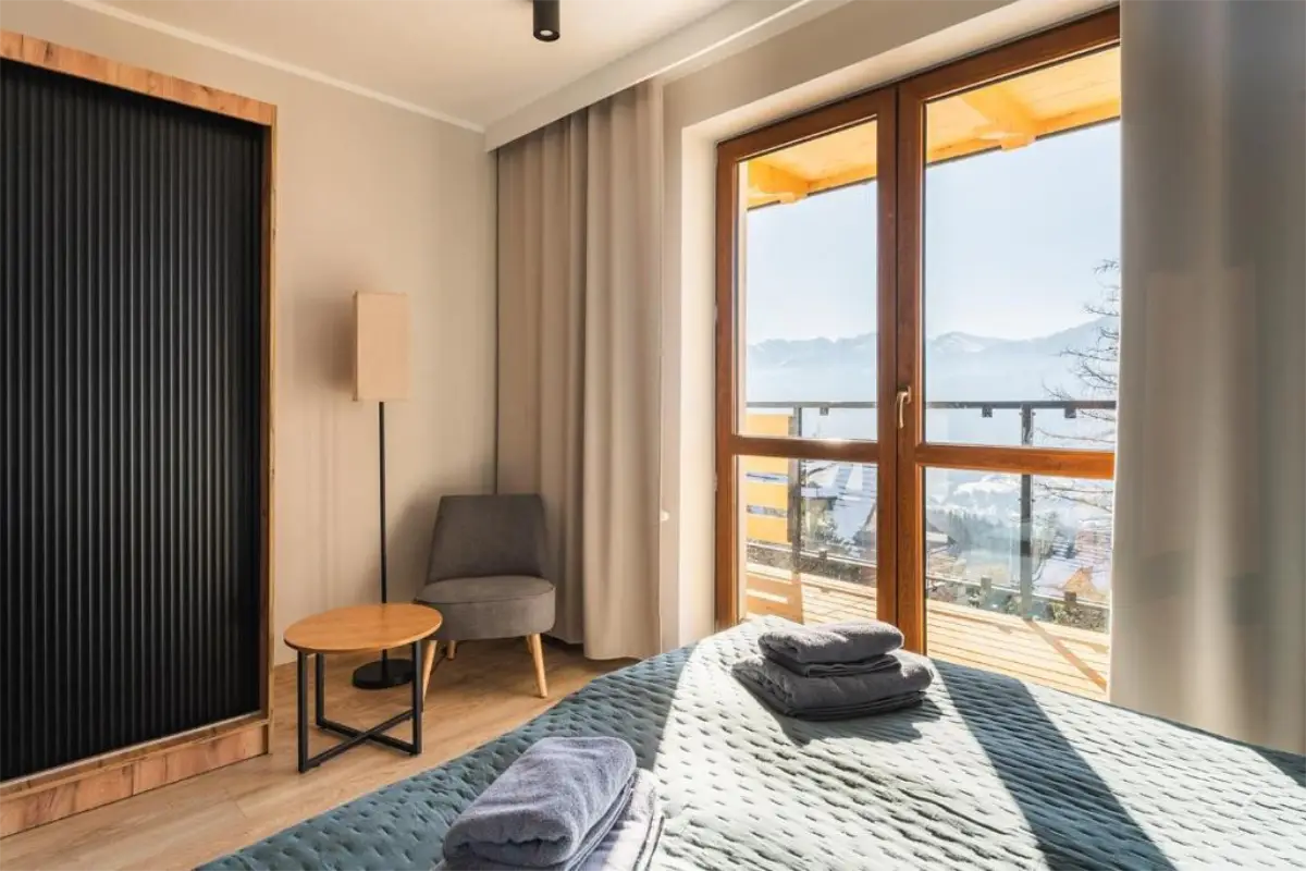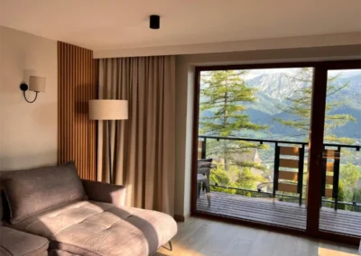 Apartament Zachodni to propozycja dla Gości, którzy szukają harmonii pomiędzy wygodą, widokami i spokojną lokalizacją. Duże okna oraz balkon sprawiają, że wnętrze jest jasne i pełne naturalnego światła, a górska panorama towarzyszy wypoczynkowi od rana do wieczora.