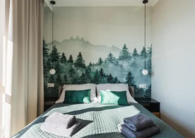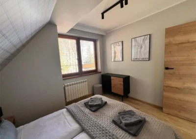 Apartament wyróżnia się kameralnym charakterem oraz układem, który zapewnia wygodę i prywatność. Oddzielna sypialnia pozwala na spokojny wypoczynek, a część dzienna z balkonem staje się naturalnym miejscem wspólnych chwil rozmów, odpoczynku i planowania kolejnych górskich wypraw.