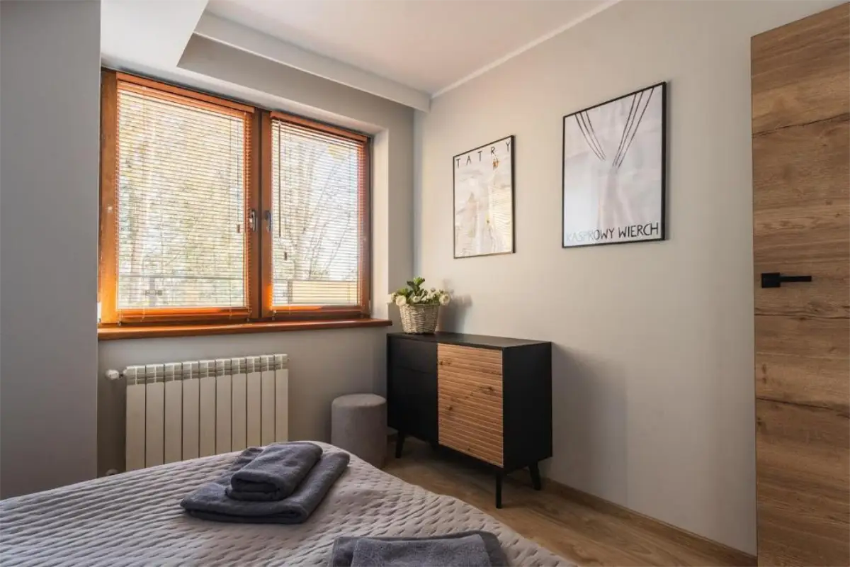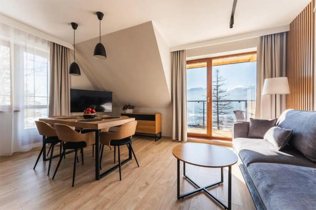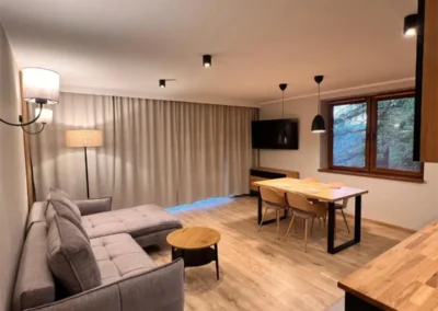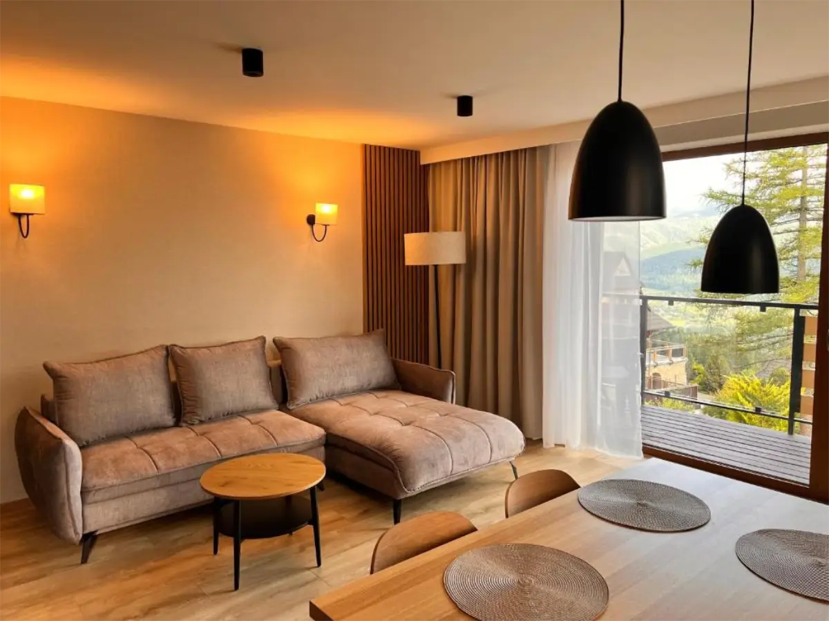 Dzięki ekspozycji południowo-wschodniej wnętrza są jasne przez większą część dnia, a widoki na Tatry można podziwiać z różnych części apartamentu. To idealne miejsce na wspólne poranki, spokojne wieczory i odpoczynek po intensywnym dniu spędzonym na górskich szlakach lub stokach narciarskich.